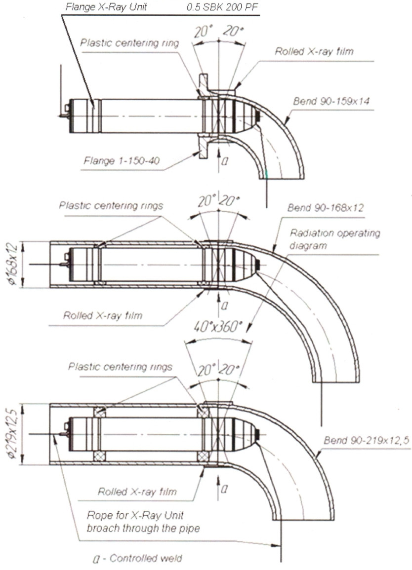 Examples of apparatus applications  0,5 SBK 200 PF at radiography of welds between bends and flanges or straight pipes.