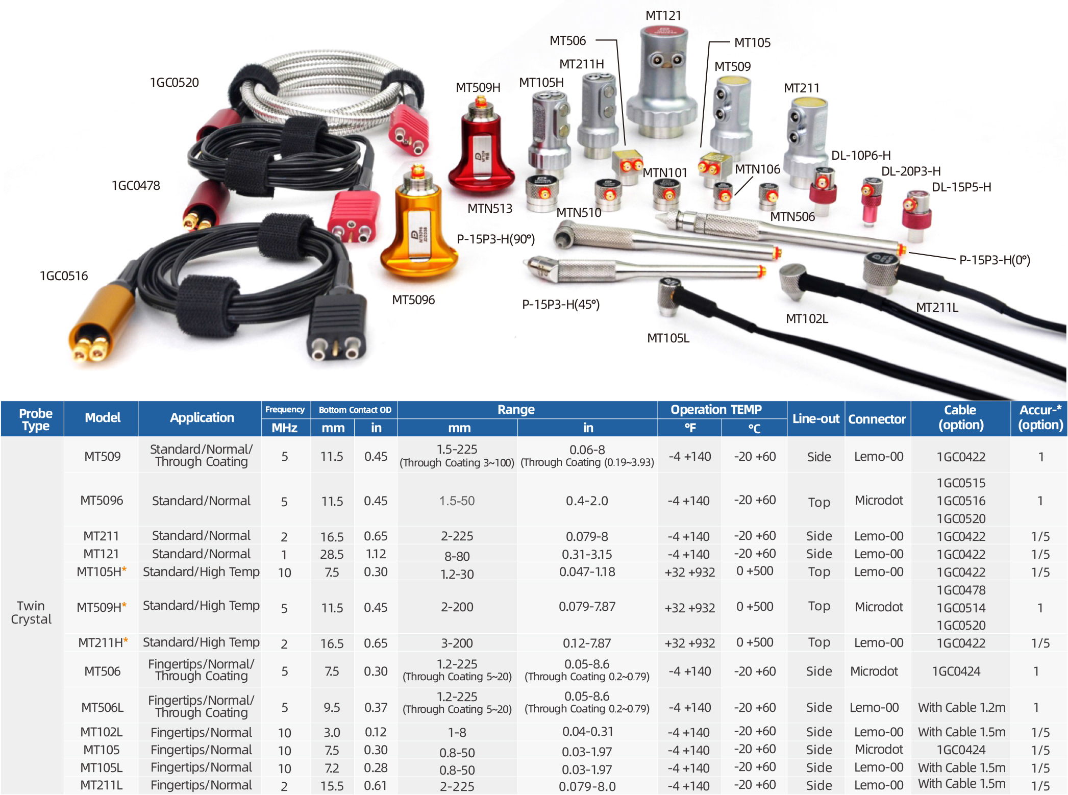 Doppler provides an existing solution for most corrosion application sites, providing a complete set of twin- crystal and single-crystal thickness measuring probes for thickness measurement of workpiece, work with Accur 1/3/5 different thickness measuring instruments, to ensure the accuracy of thickness measurement to the greatest extent; besides the measurement of corrosion wall thickness, it can also be used for small diameter pipelines, etc. Measurement and application of tubing, boiler tube wall, penetrating coating, spot weld integrity, probes with different frequencies, contact sizes and special high temperature applications are available for selection.
